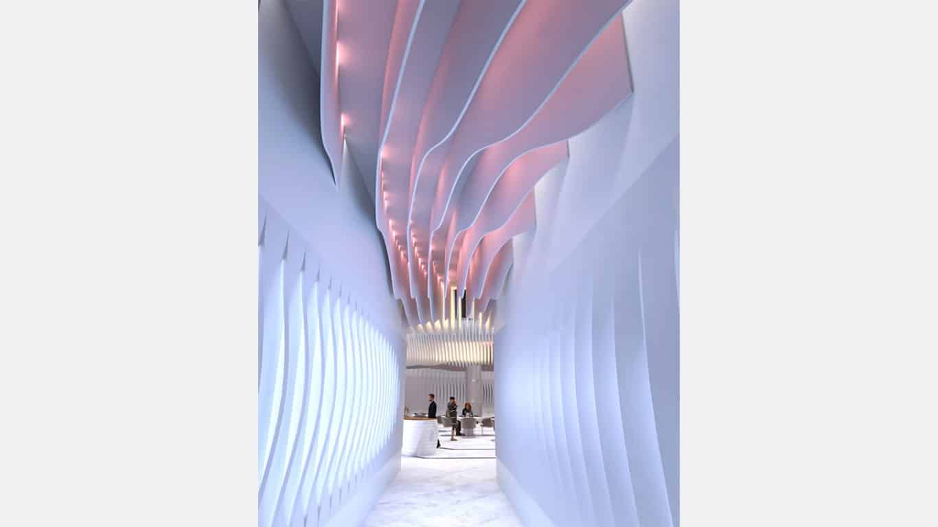 Also, the architectural design of the new entrance not only provides a beautiful shape and identity, but we are talking about a dynamic design that interacts with people and gives the place a strong interactive symbol, that the waves made of fabric will be moved from the natural air and this will leave them in generating a sense of the sea waves.